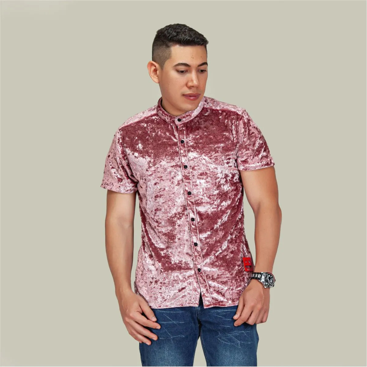 Camisa Manga Corta Resplandor Purpura Plata Cuello Mao