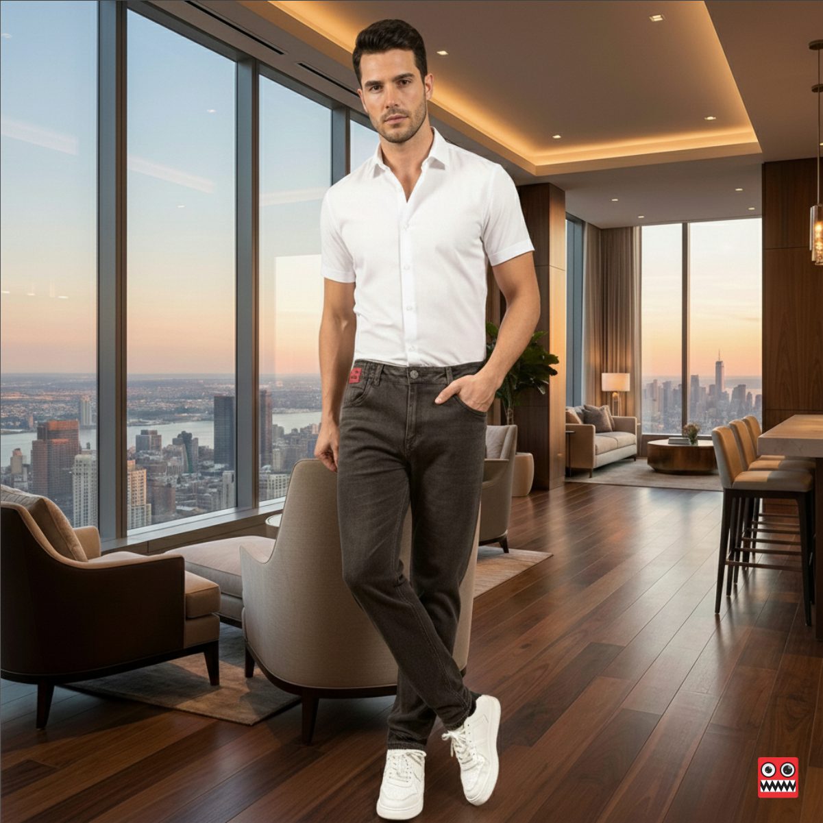 >Modelo de la imagen tiene de altura 175 cm, peso 70 kg, utiliza talla 32